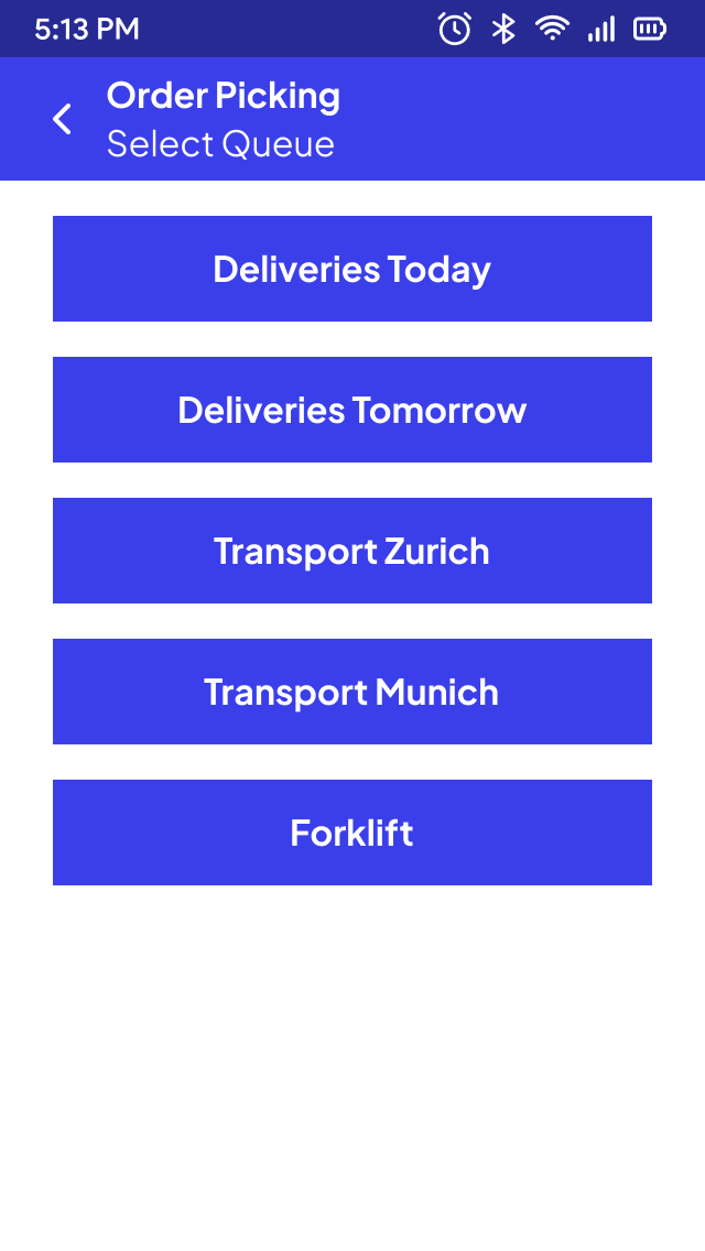 - Workloads are distributed to employee's mobile devices via queues. This ensures transfer orders are processed in a structured way, and individual steps can be validated with a simple barcode scan.