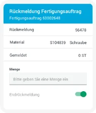 On the employee’s MDE device, SAP-managed detailed data for production orders is displayed. Depending on the system configuration, the employee can enter relevant information such as Yield quantity, Scrap quantity, and Scrap reason. Based on the reported quantity and the remaining open order quantity, SAP automatically determines whether the posting is a partial confirmation or a final confirmation.